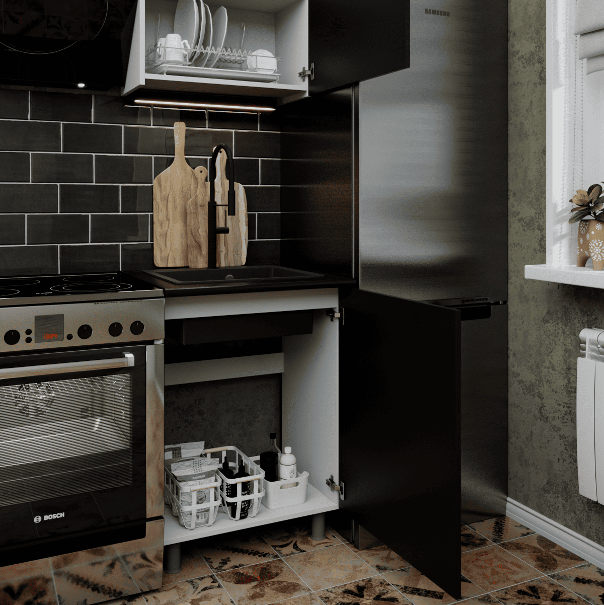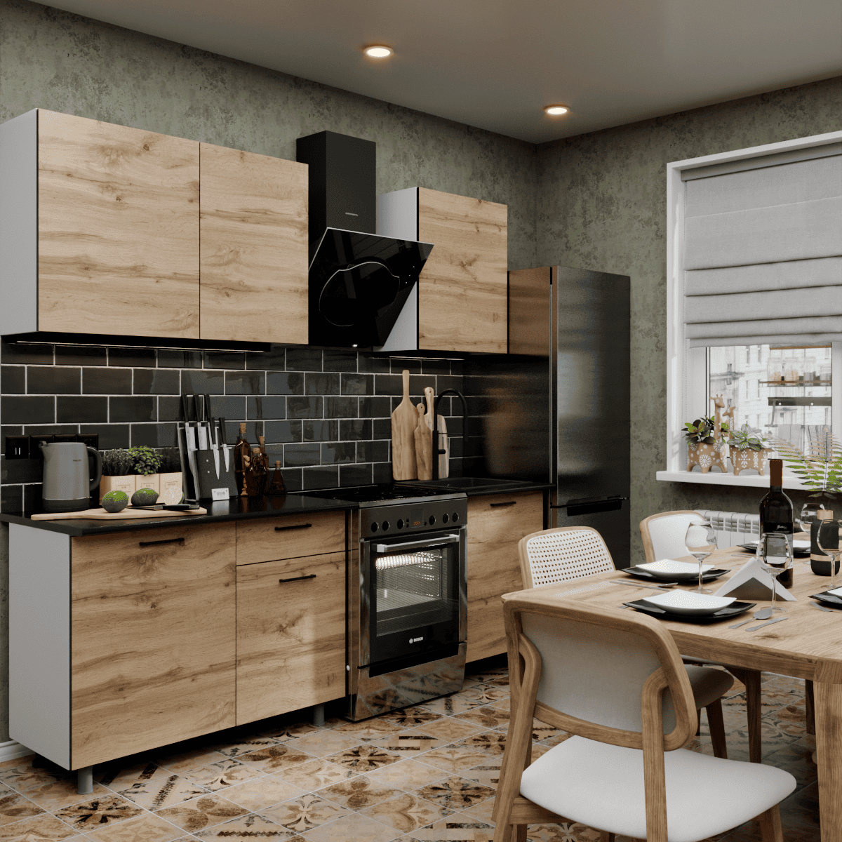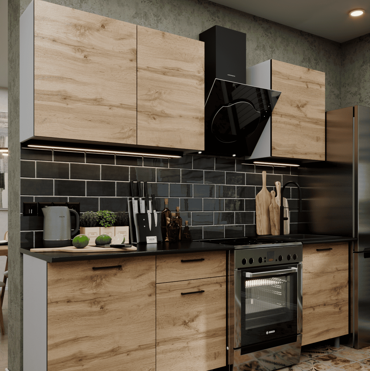Представляем вашему вниманию кухонный гарнитур ЛАВАНДА, который идеально воплощает черты лофта и эко-минимализма: эта стильная кухня привлекает взгляд фасадами в насыщенном декоре «дуб золотой» с реалистичной древесной текстурой. Готовая кухня построена на эффектном контрасте теплых оттенков дерева и графичных черных акцентов, создавая уютную атмосферу. Верхний ярус без лицевой фурнитуры визуально облегчает пространство, а нижние секции обеспечивают высокую функциональность. Рабочая зона для удобства монтажа комплектуется двумя столешницами размером 1100х600х26 мм и 600х600х26 мм, что позволяет гибко организовать пространство. Благодаря регулируемым опорам и продуманной эргономике, эта кухня для дома станет практичным решением, сочетающим современный дизайн с удобством ежедневного использования.