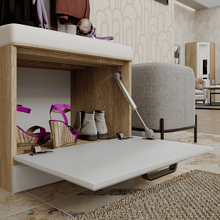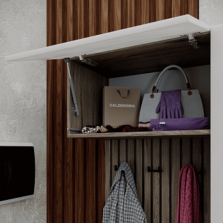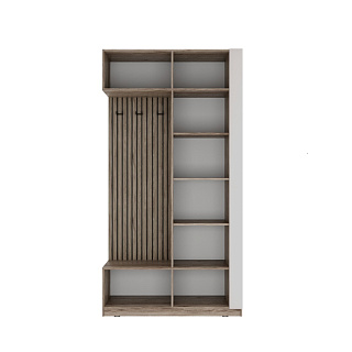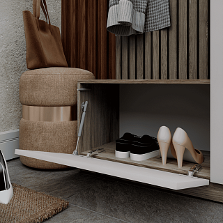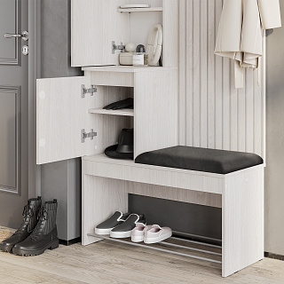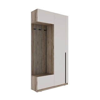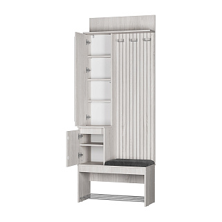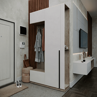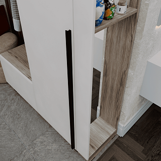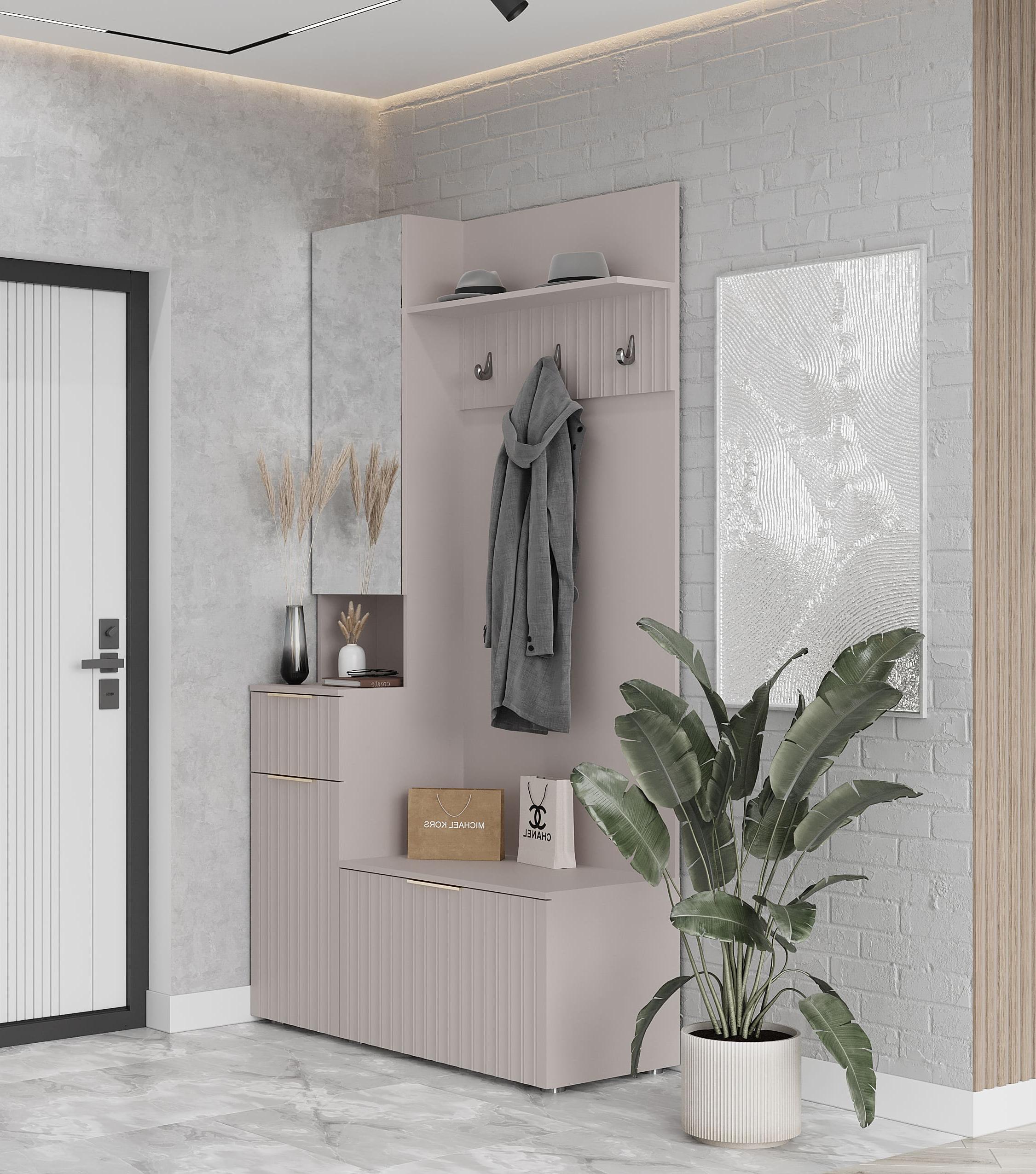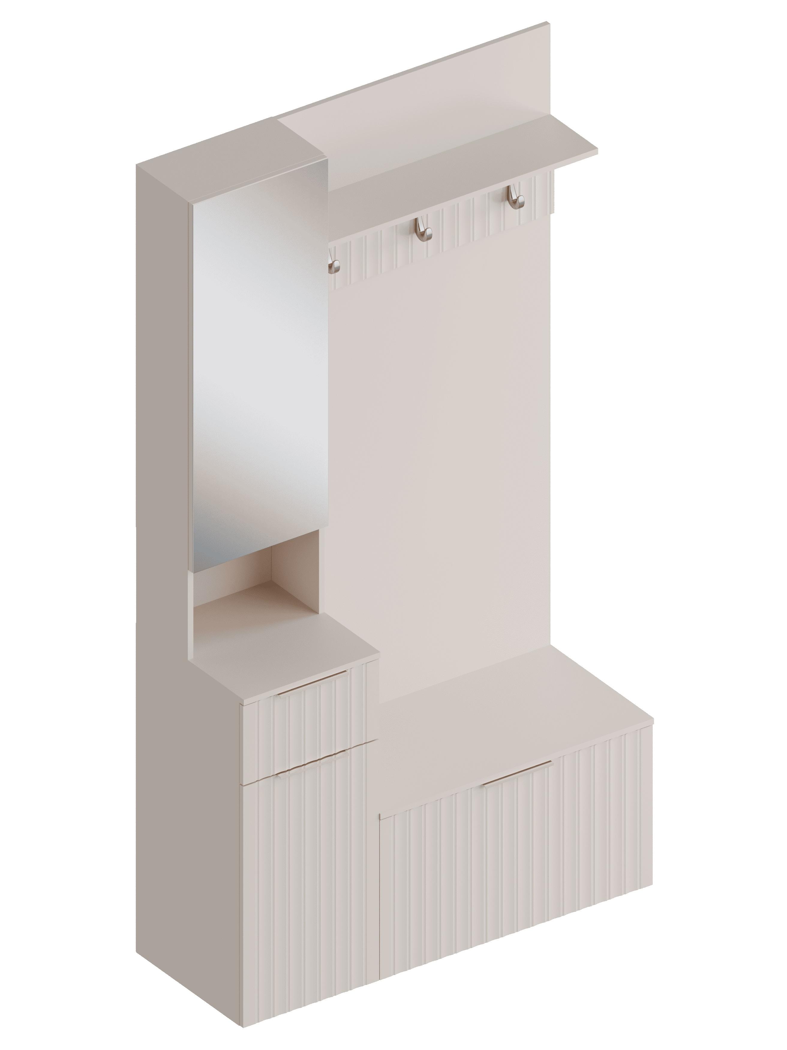 Элегантная и функциональная прихожая ТЕФИЯ 1200 — это идеальное решение для создания стильного и организованного пространства во входной зоне вашего дома. Модель шириной 1200 мм выполнена в благородном матовом оттенке тефия,сантьяго софт, который в сочетании с изысканной вертикальной фрезеровкой фасадов придает интерьеру современный и дорогой вид. В данной модификации в левом исполнении предусмотрен навесной зеркальный шкаф с открытой нишей под ним, что позволяет удобно хранить аксессуары и проверять свой образ перед выходом. Открытая зона вешалки оснащена прочными крючками и антресольной полкой для головных уборов, а нижний ярус представлен комбинированной системой хранения: вместительной откидной обувницей и дополнительной тумбой с выдвижным ящиком. Если вы хотите купить компактную прихожую с зеркалом, которая объединит в себе эстетику рифленых фасадов и продуманную эргономику, модель серии ТЕФИЯ станет вашим безупречным выбором.